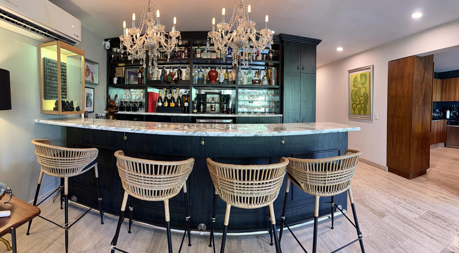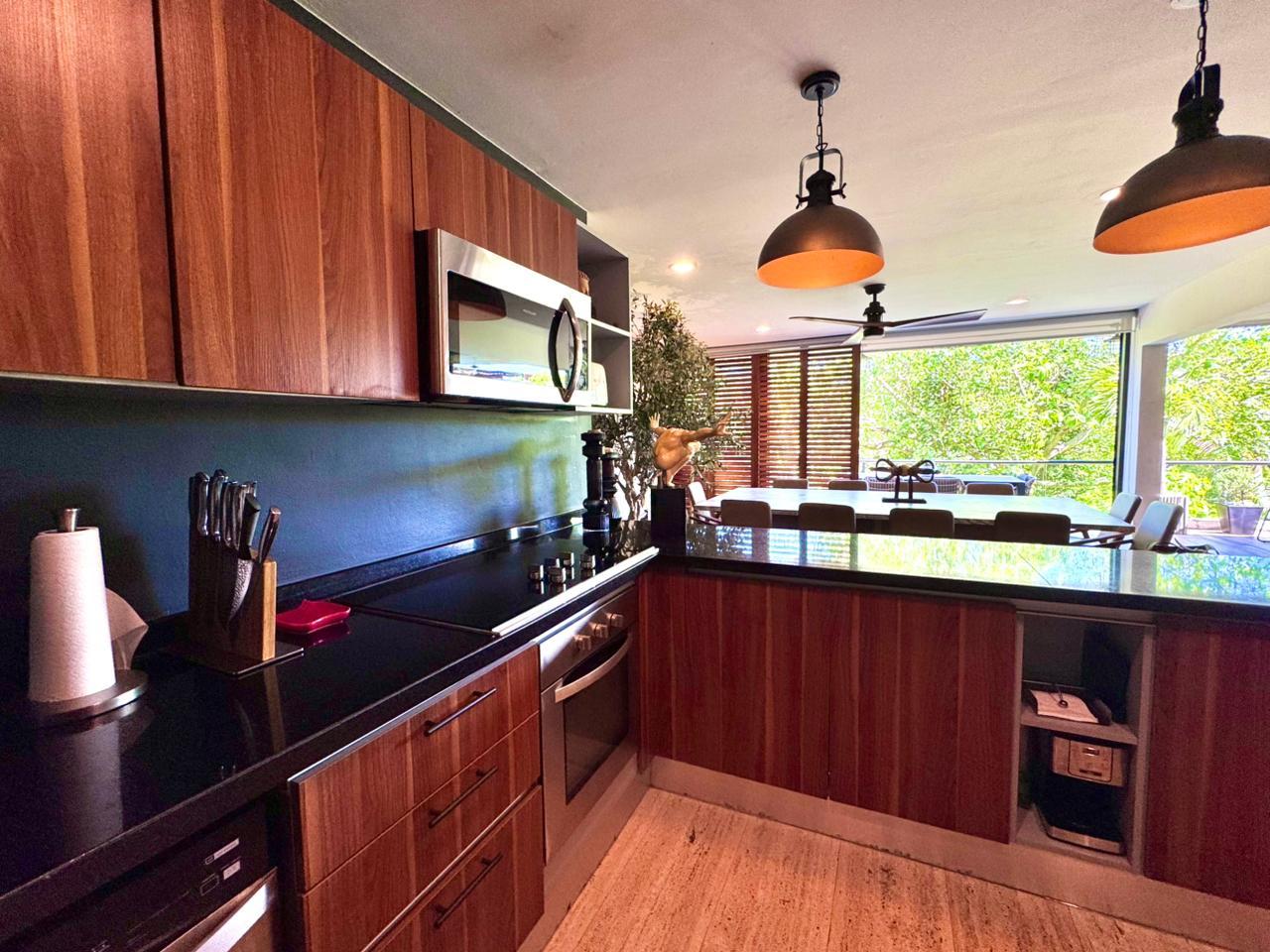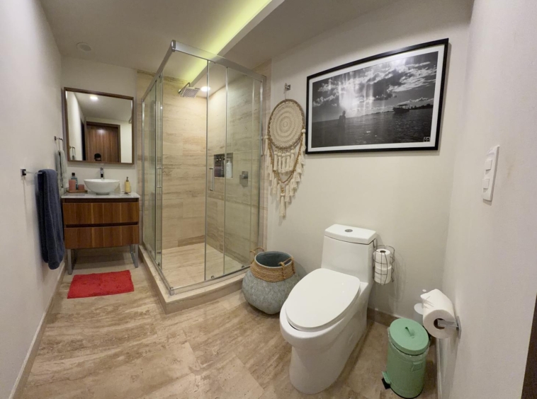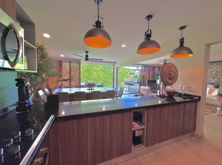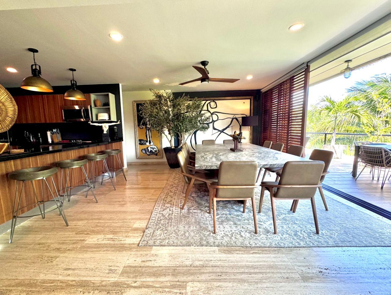 La propiedad ofrece una sala–comedor de gran amplitud, integrada a una terraza generosa, ideal para reuniones y para disfrutar de un estilo de vida interior–exterior. Cuenta además con un bar integrado y una cocina funcional y bien proporcionada, diseñada para acompañar cómodamente la vida social del departamento.