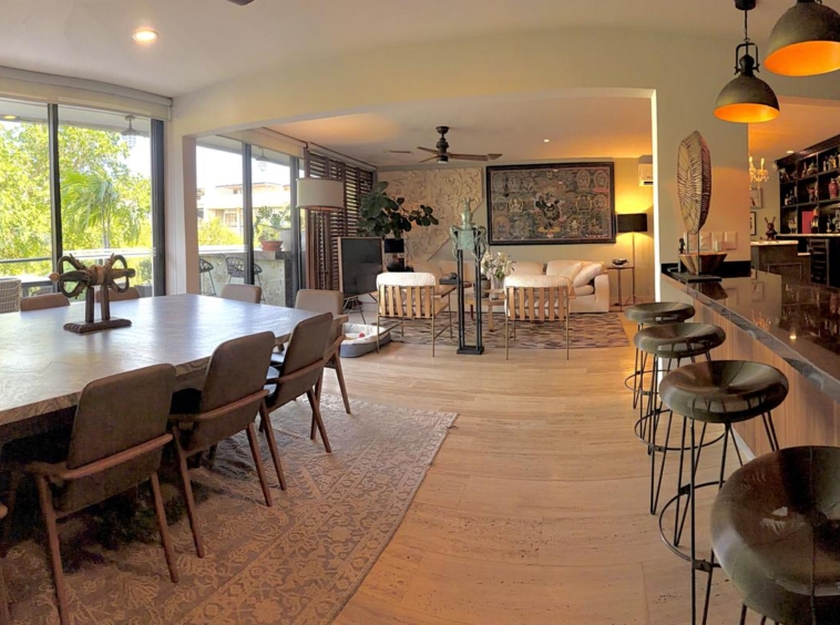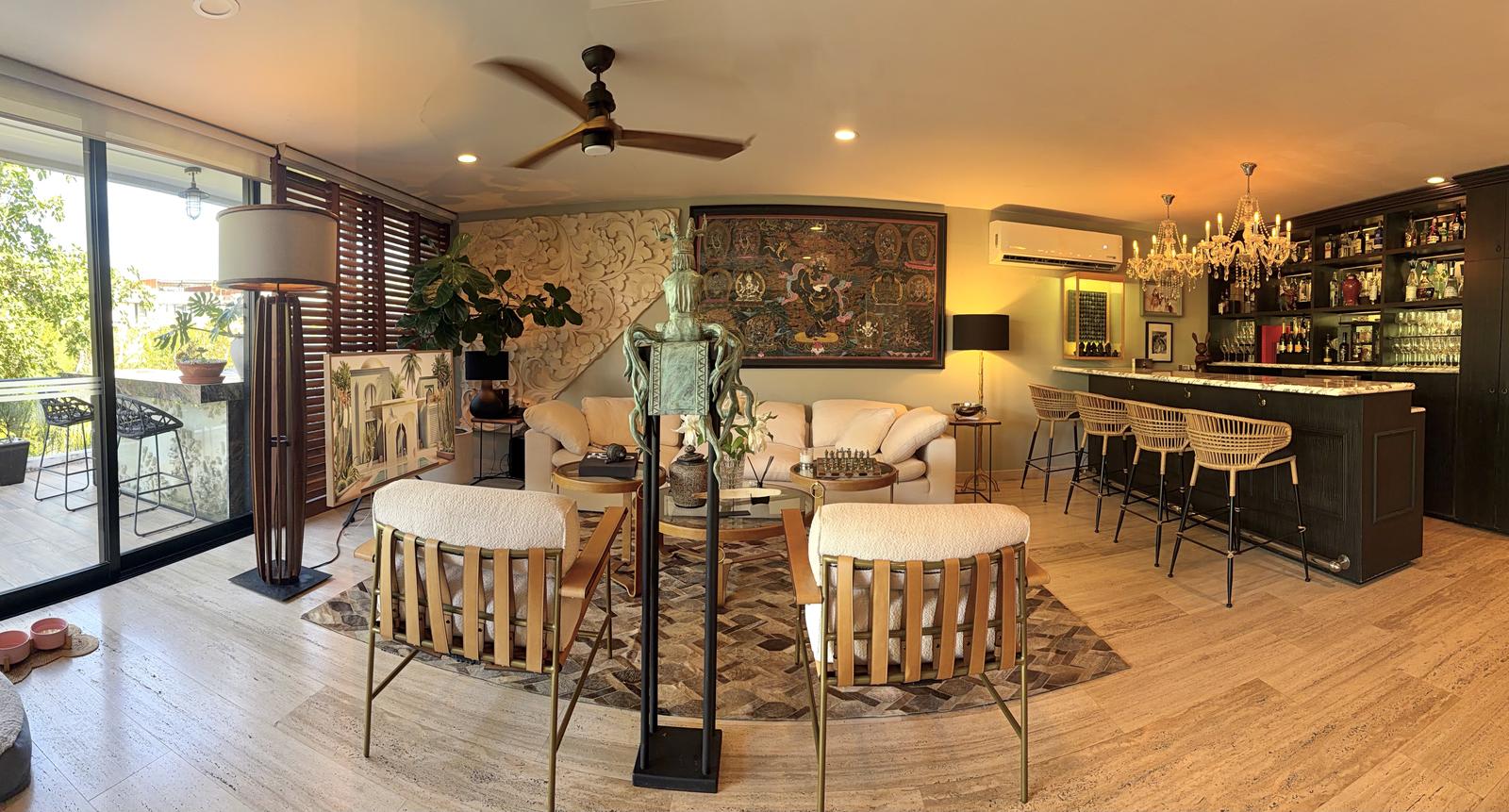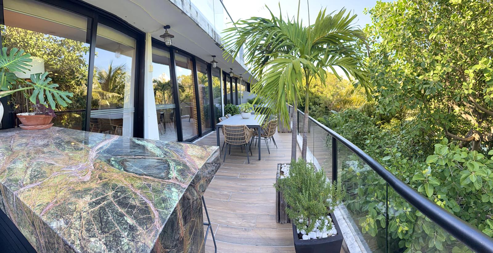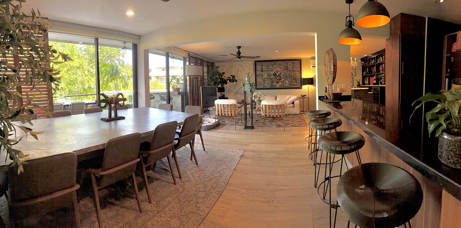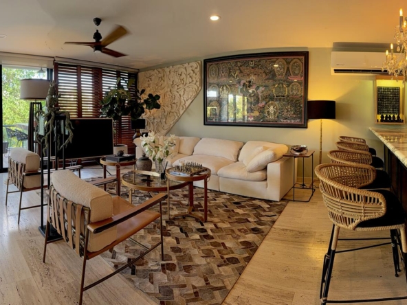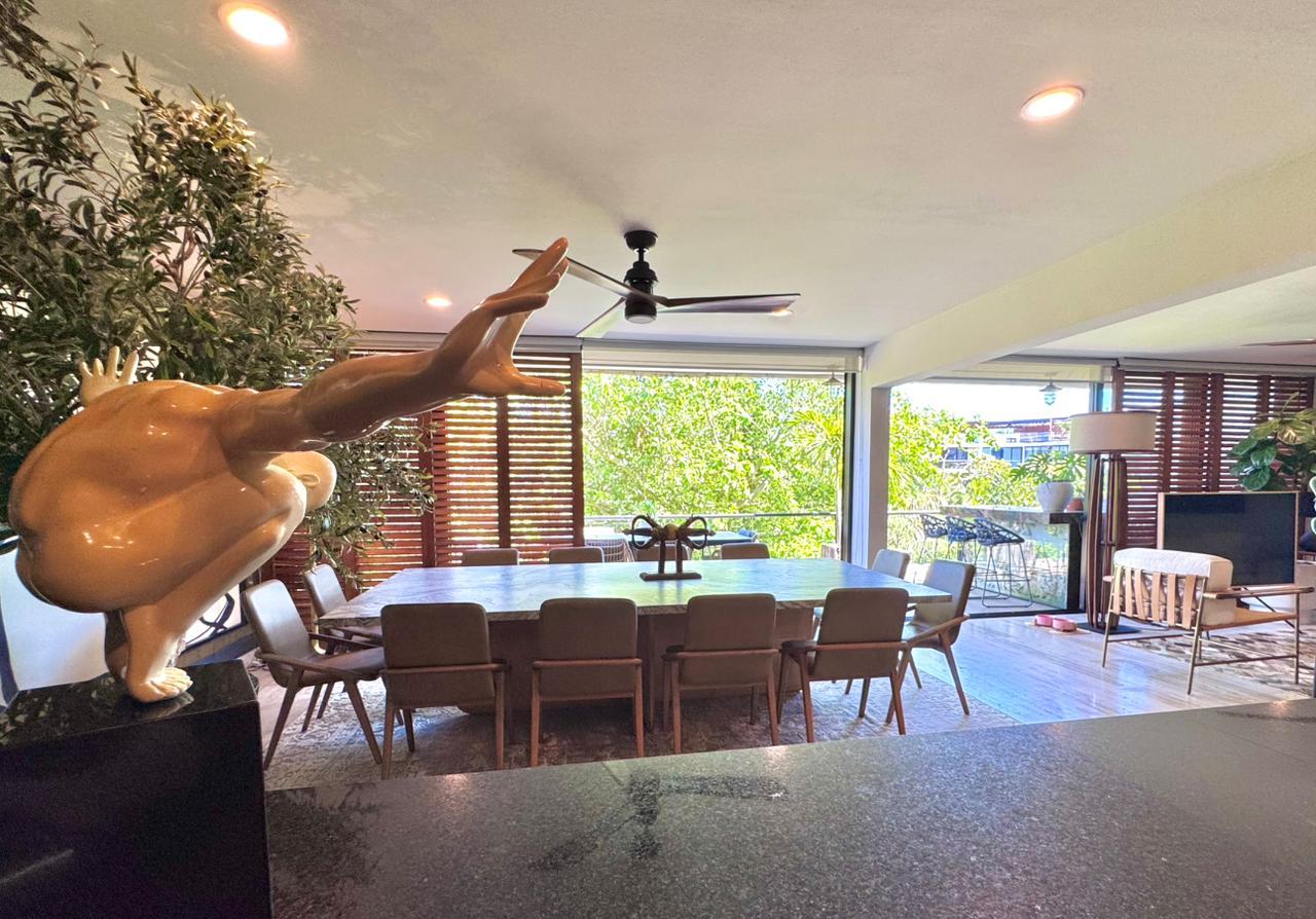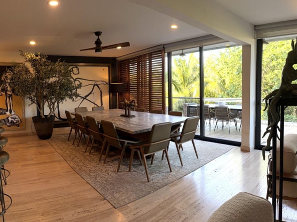 Departamento de tipología única dentro del exclusivo condominio AWA Playacar, resultado de la fusión de dos unidades originalmente de 2 recámaras, lo que da lugar a una residencia con distribución excepcional y amplios espacios sociales.