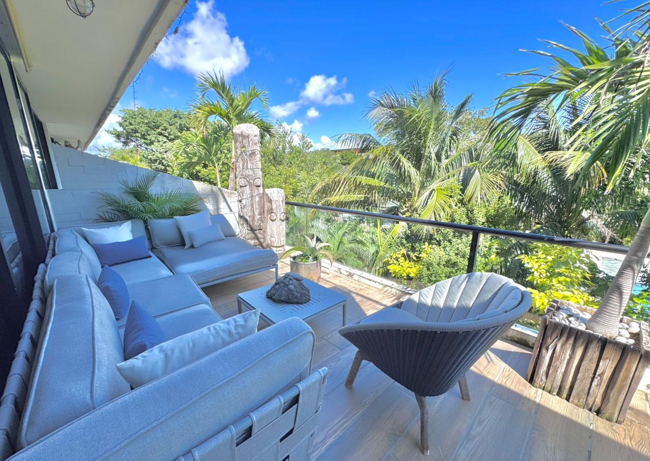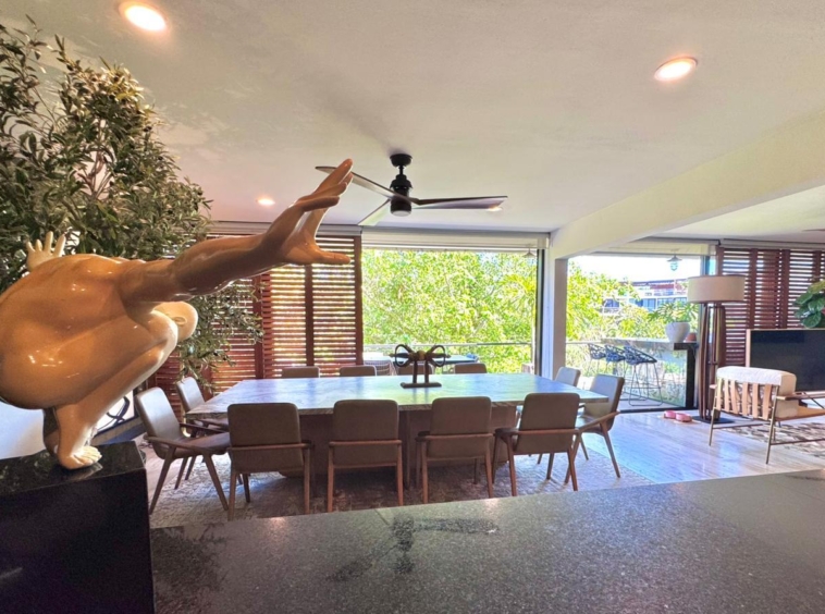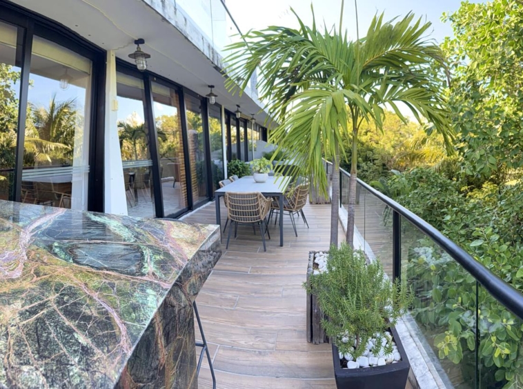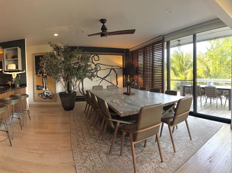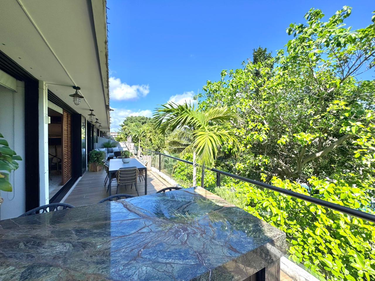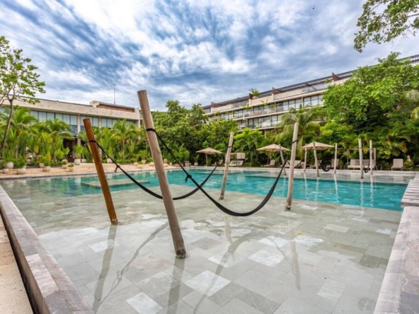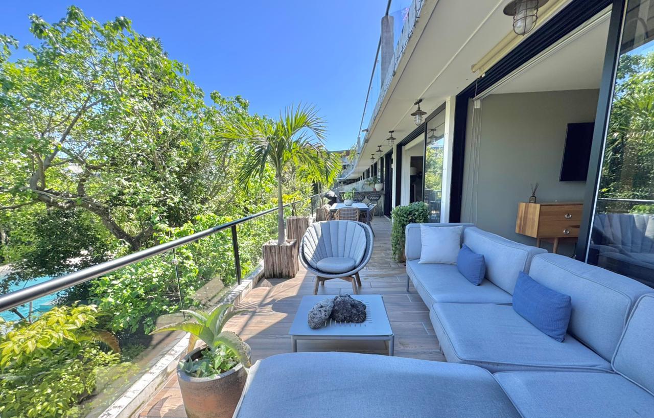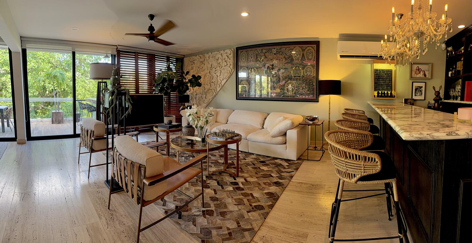Departamento de tipología única dentro del exclusivo condominio AWA Playacar, resultado de la fusión de dos unidades originalmente de 2 recámaras, lo que da lugar a una residencia con distribución excepcional y amplios espacios sociales.