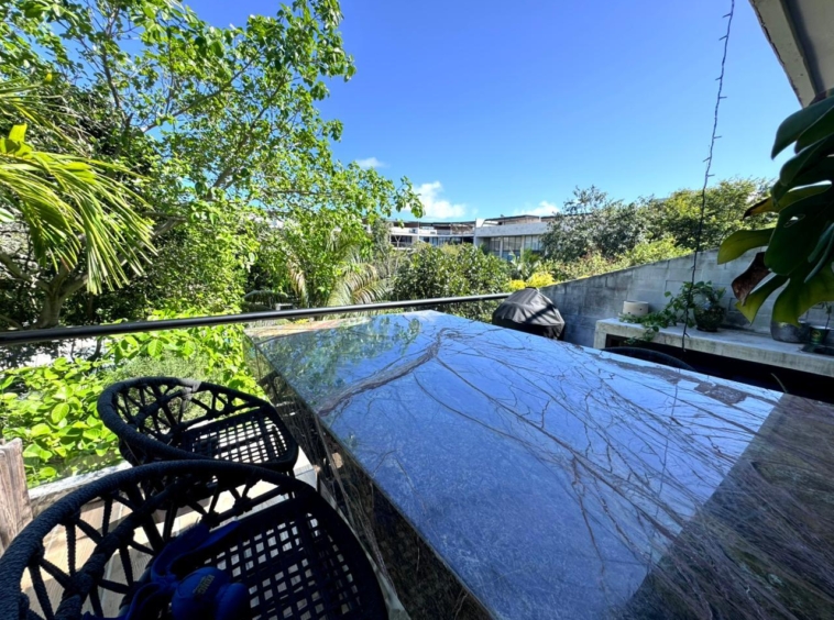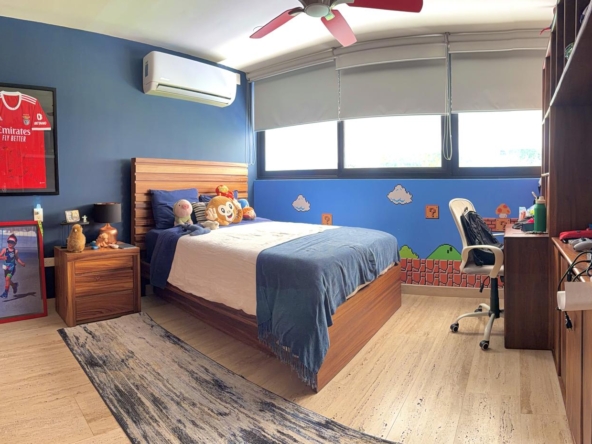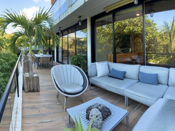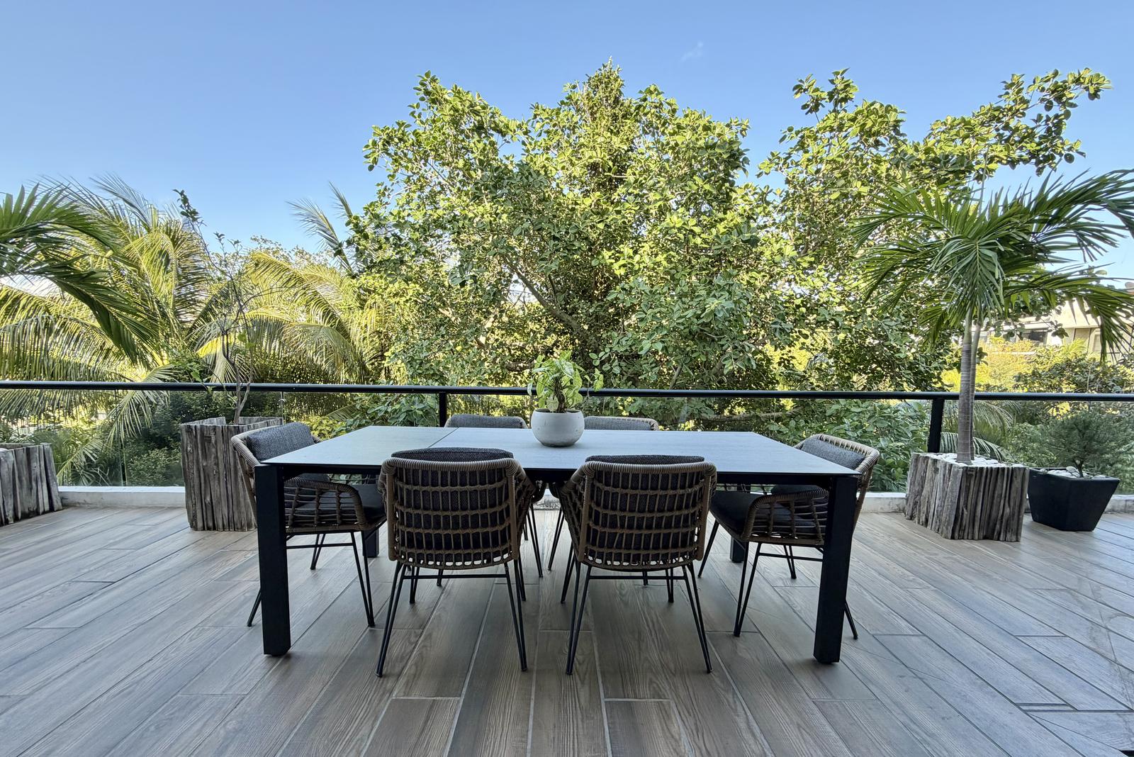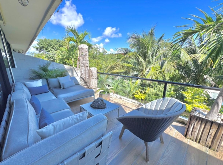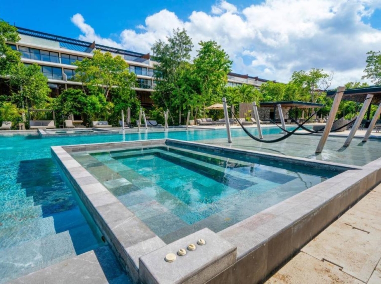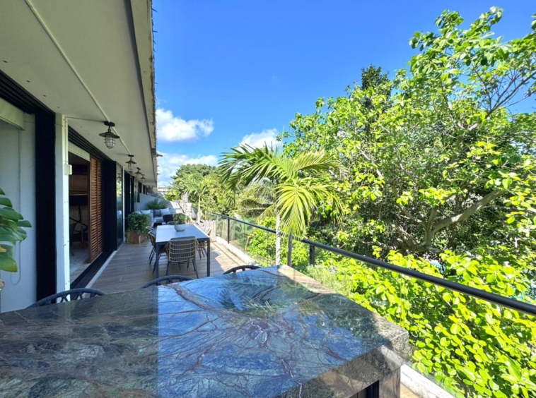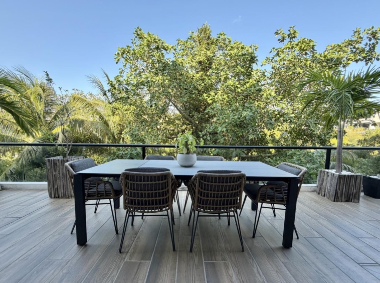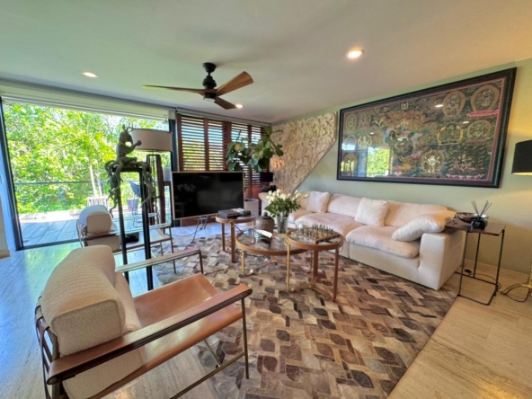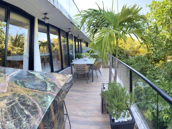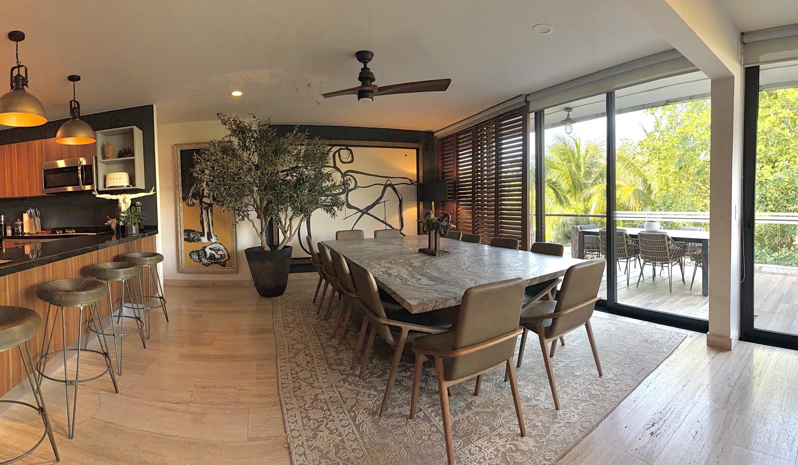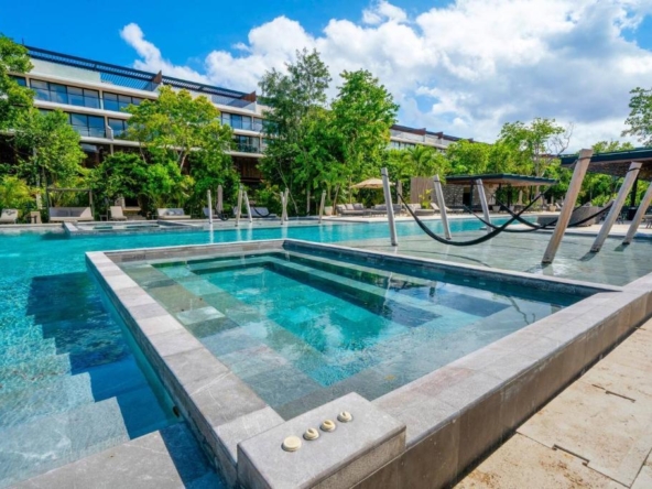 Departamento de tipología única dentro del exclusivo condominio AWA Playacar, resultado de la fusión de dos unidades originalmente de 2 recámaras, lo que da lugar a una residencia con distribución excepcional y amplios espacios sociales.